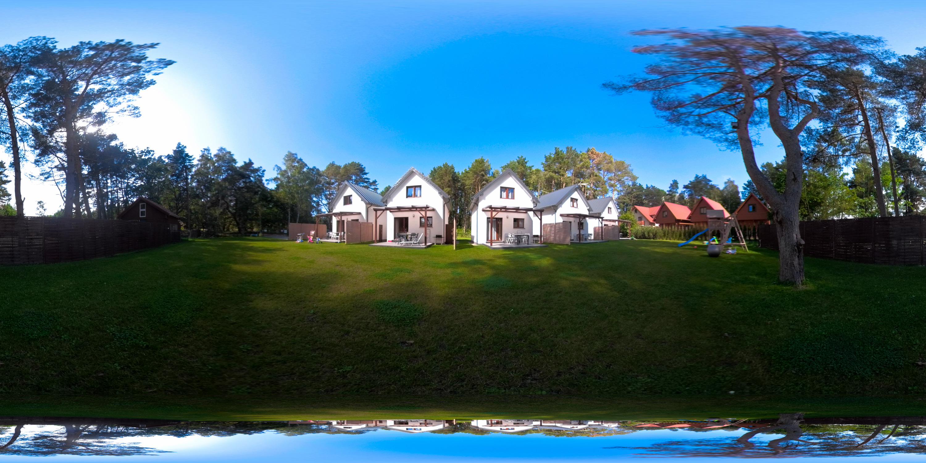 Na zewnątrz: Plac zabaw, parking na naszym ogrodzonym terenie, 1x grill na domek. Nasi goście mają do dyspozycji duży, zielony ogród, który porasta bujna, zadbana trawa.